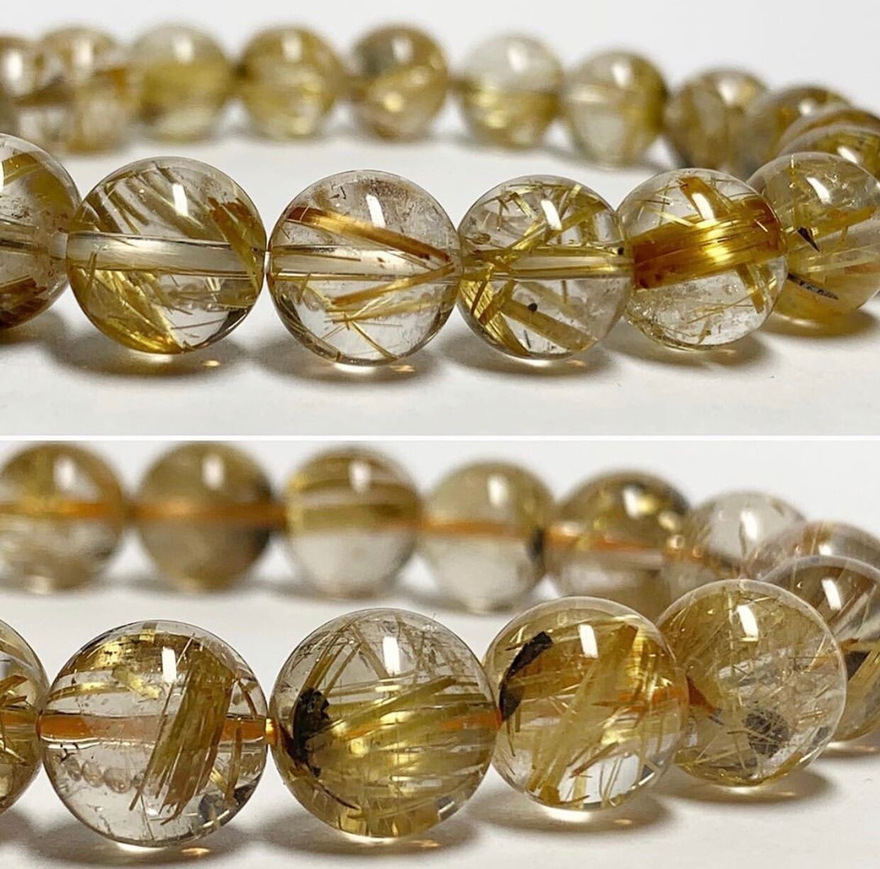 透明度もあり、ゴールドの太針もしっかりと入っています。ヘマタイトが入っている粒もあり、見る角度によっていろんな表情を見せてくれます。