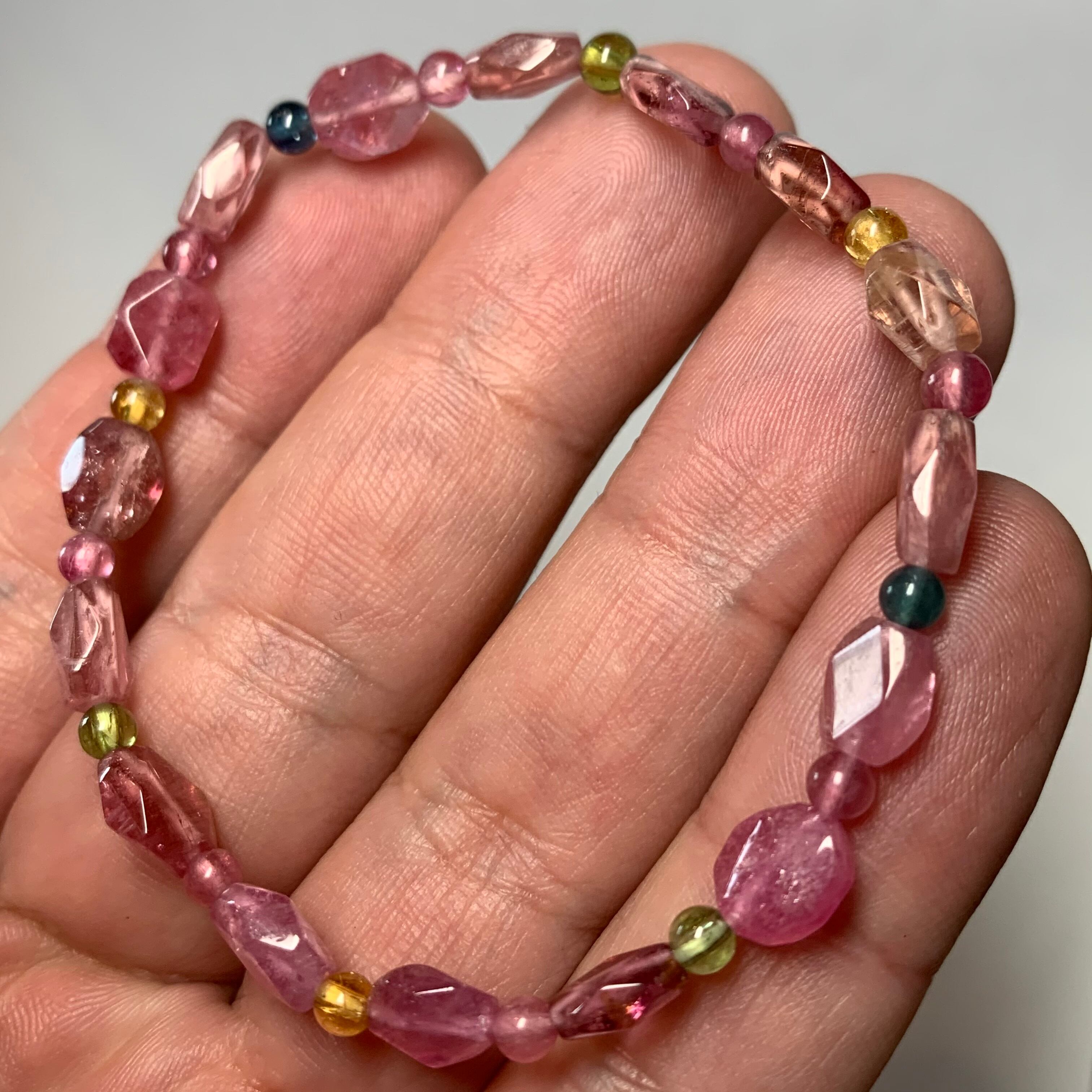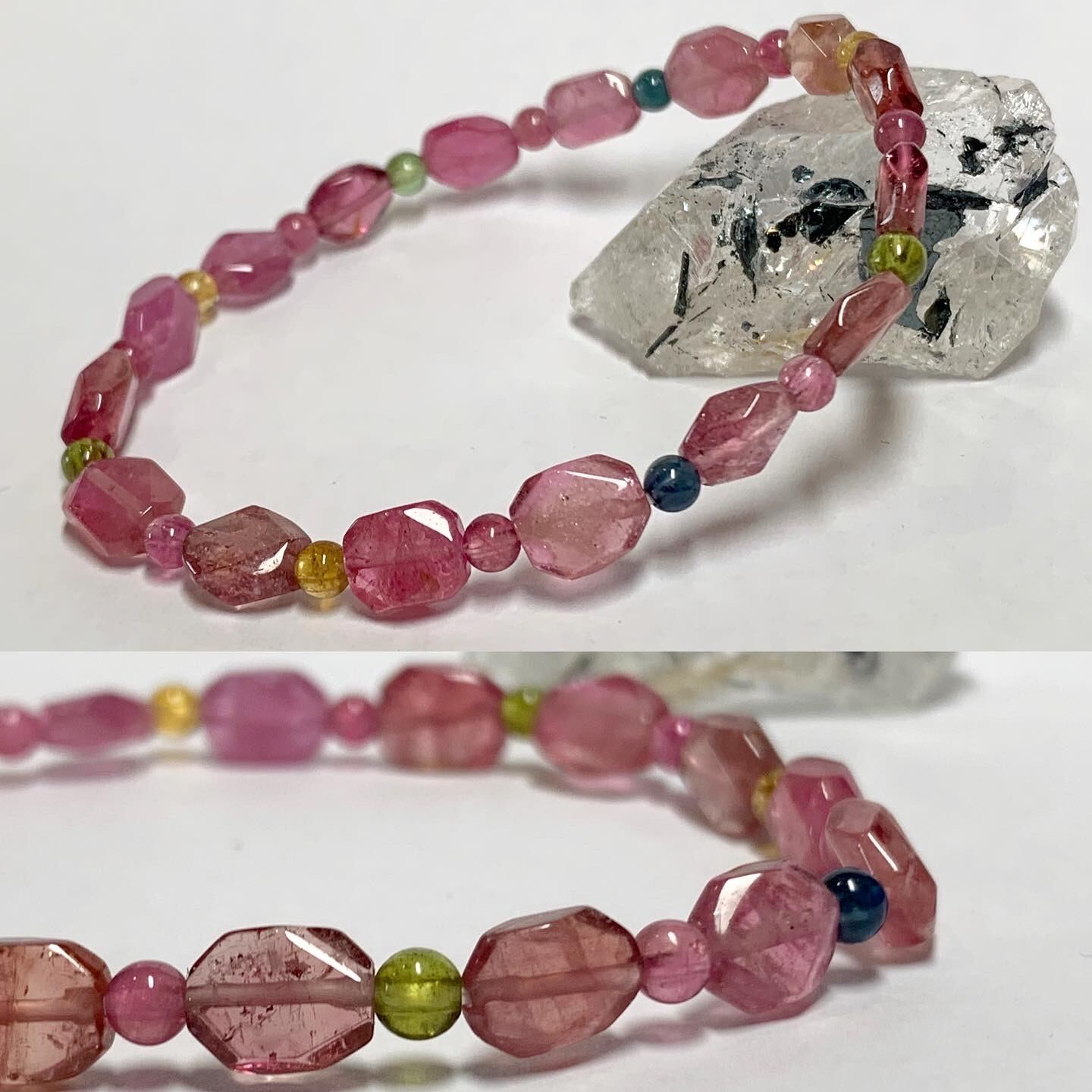 透き通ったピンクトルマリンがベースで、間には3.5〜4ミリのトルマリン各色が入っています。