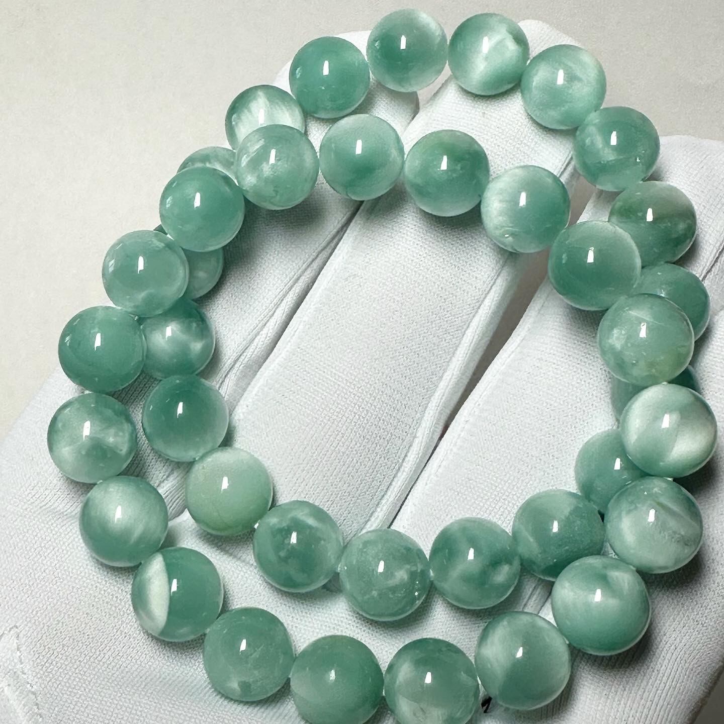 ぱっと見は明るいグリーン系のラリマーのようで、白い部分はフェザーインフローライトのような羽根感と、細かな繊維状なので