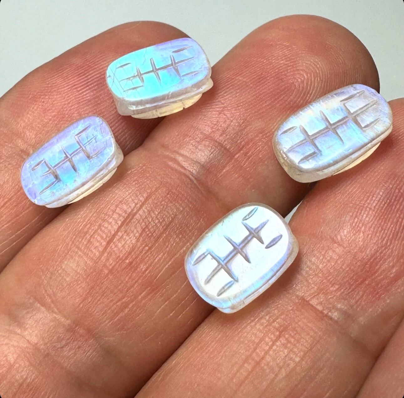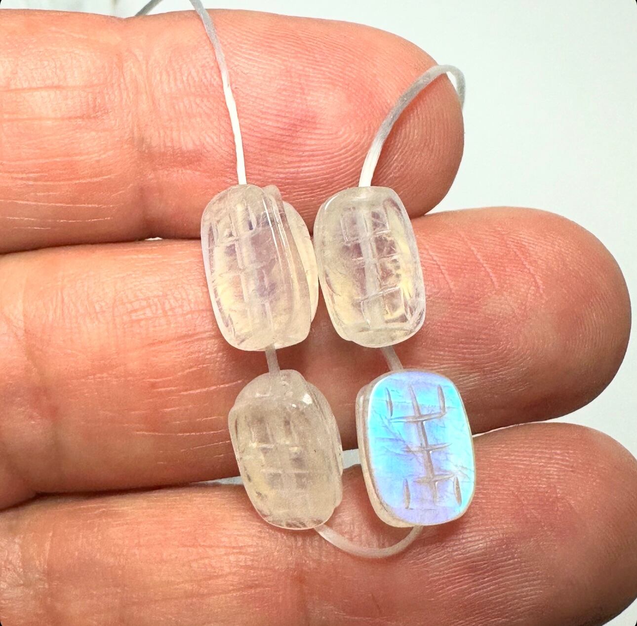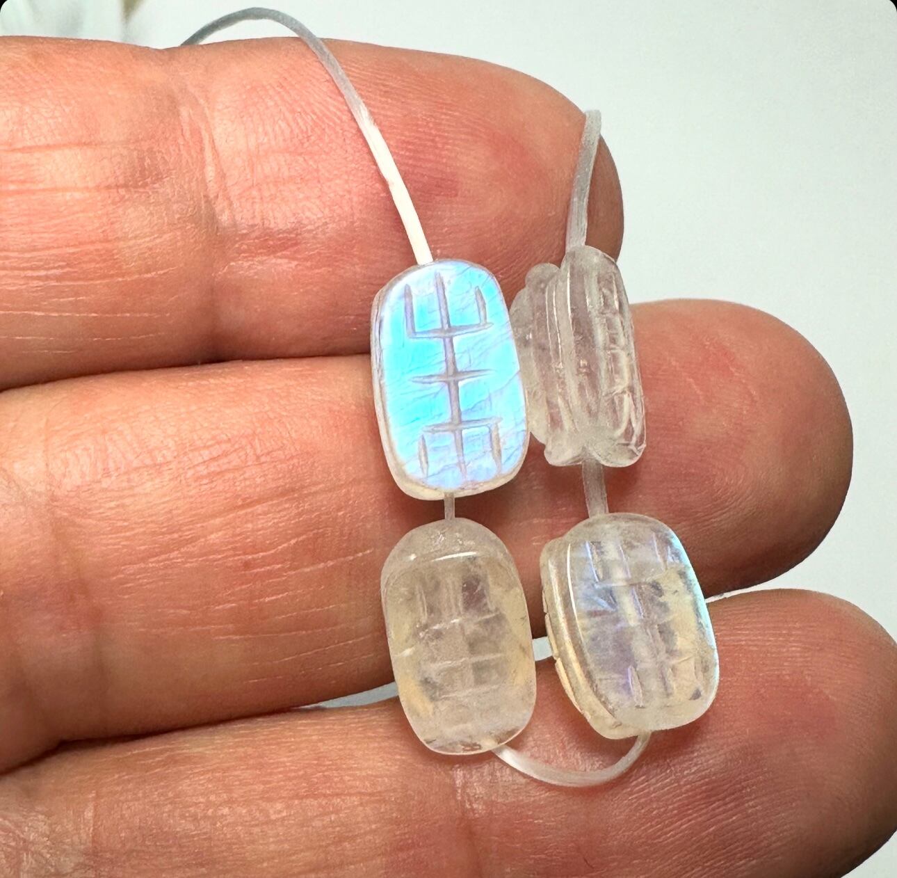 どの粒も透明度が高く美しいブルーシラーもしっかり浮かび上がる亀の甲モチーフのムーンストーンです。